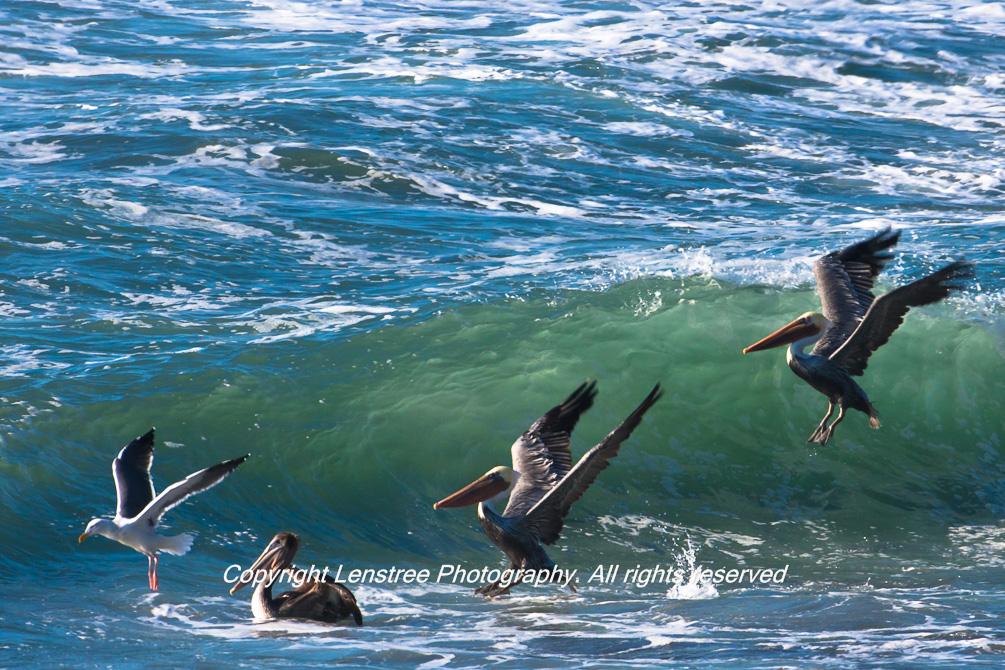 Pelicans Against a Wave